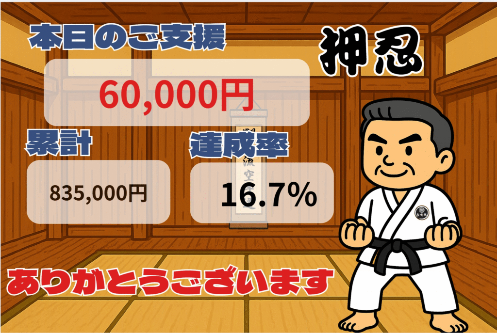 昨日のご支援は 60,000円、累計支援額は 835,000円(達成率16.7%) となりました。