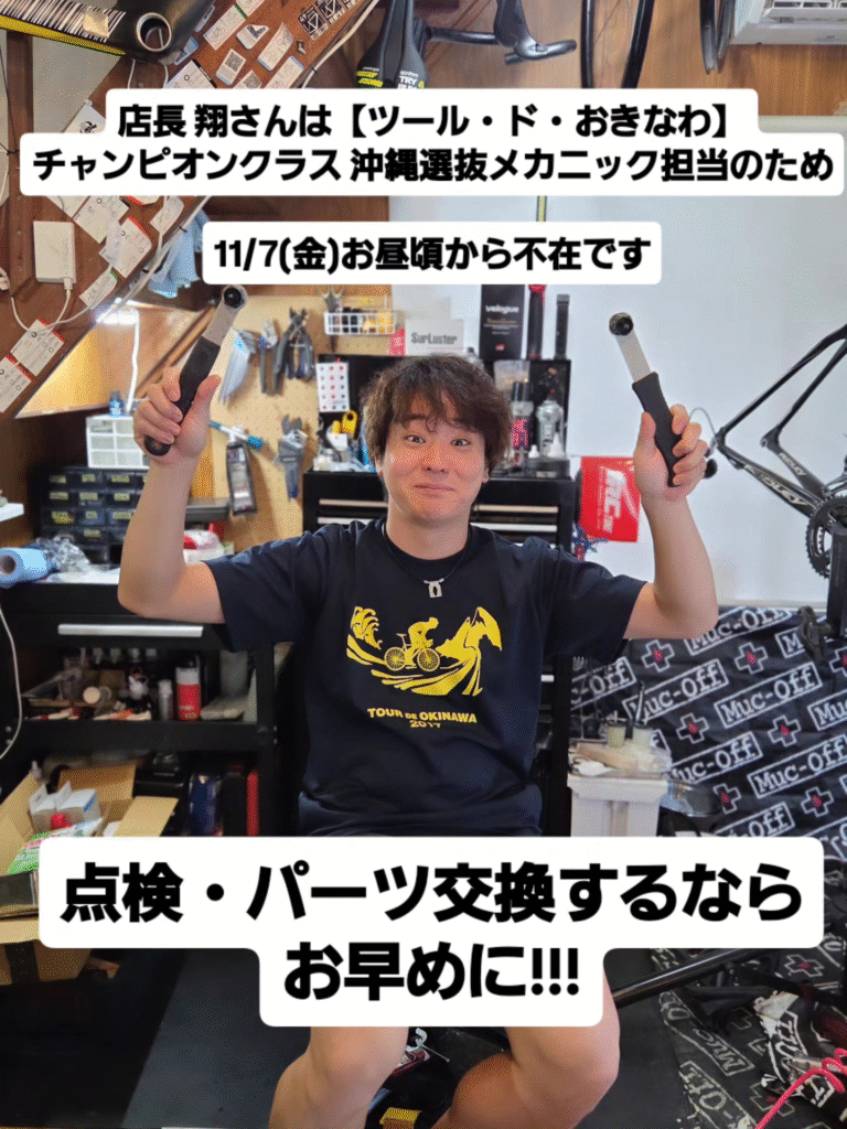 店長の翔さんはツール・ド・おきなわチャンピオンクラス沖縄選抜のメカニック担当のため、11/7(金)のお昼頃からお店不在です。