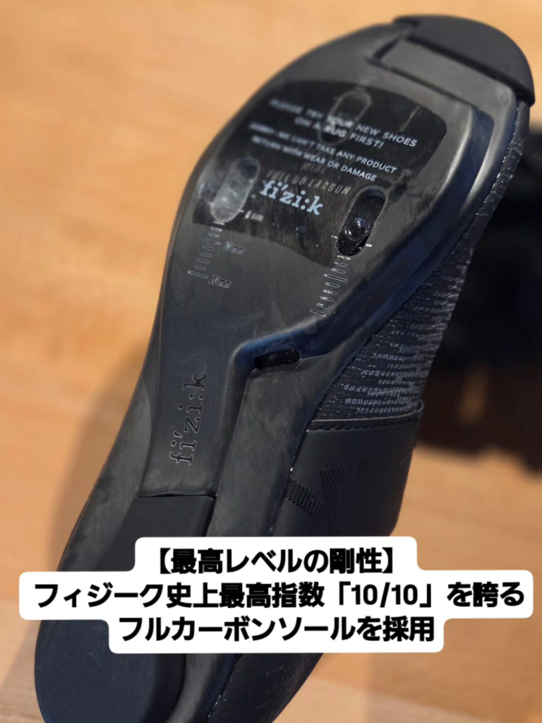 「R2カーボンソール」: フィジーク史上最高指数「10/10」を誇るフルカーボンソールを採用。踏み込んだ力を逃さず推進力へと変換します。