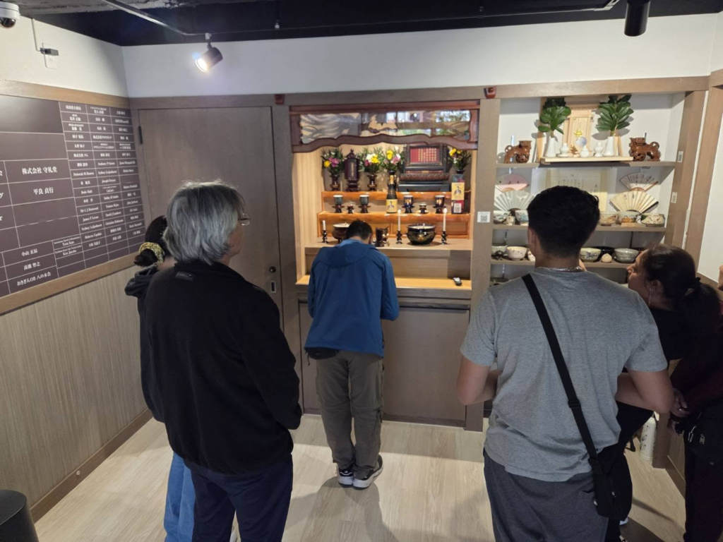 焼香体験では静かに手を合わせ、力石持ち上げ体験では真剣な表情で挑戦。